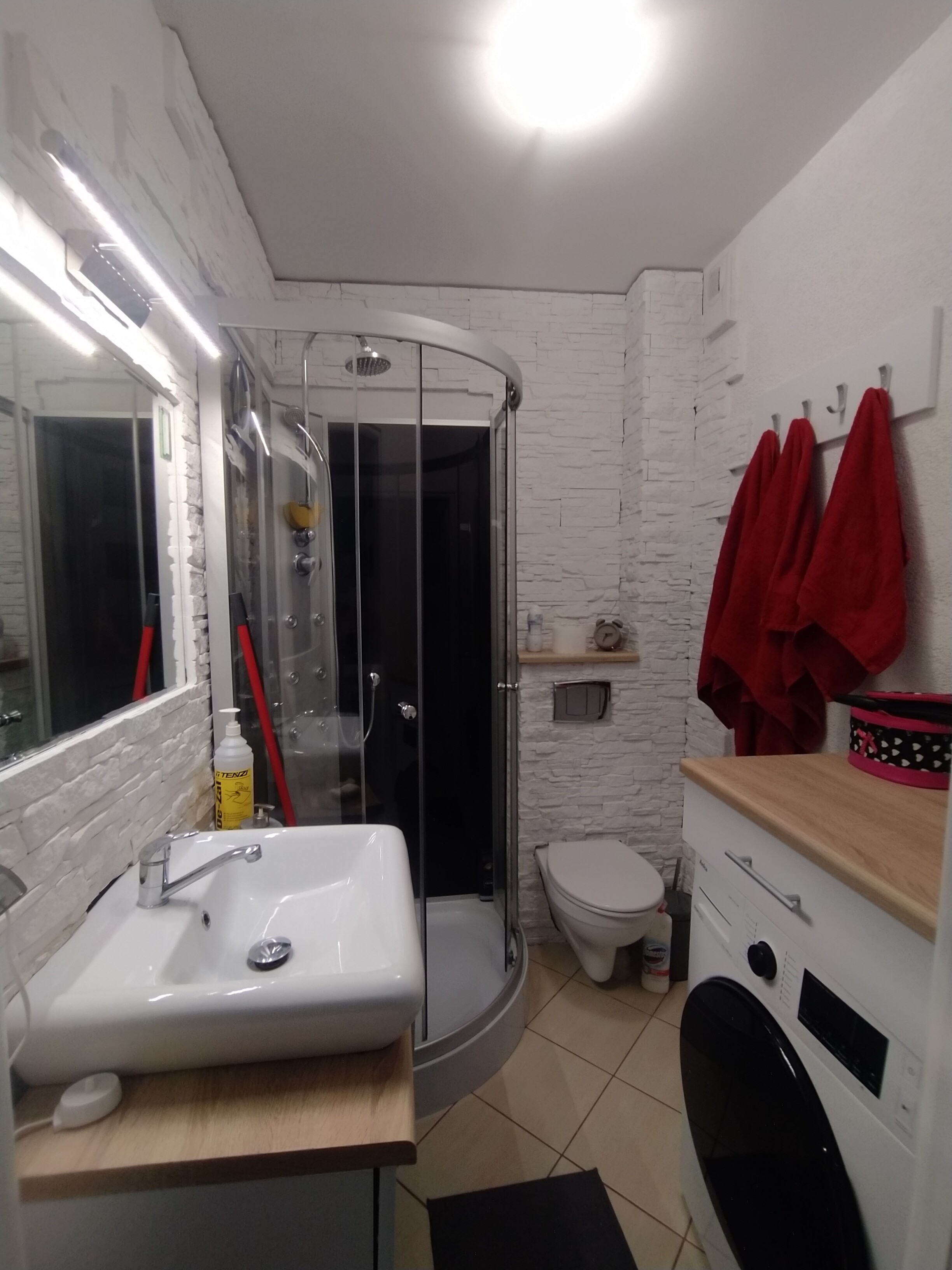 Ok, zatem zacznijmy od początku. Wystarczy tylko spojrzeć, żeby zauważyć, że jest kilka przedmiotów, które od razu przykuwają uwagę. Według mnie, zdecydowanie na pierwszy plan wysuwają się te czerwone ręczniki i jakaś kosmetyczka. Te rzeczy w ogóle nam tam nie pasują, więc je zabieramy.