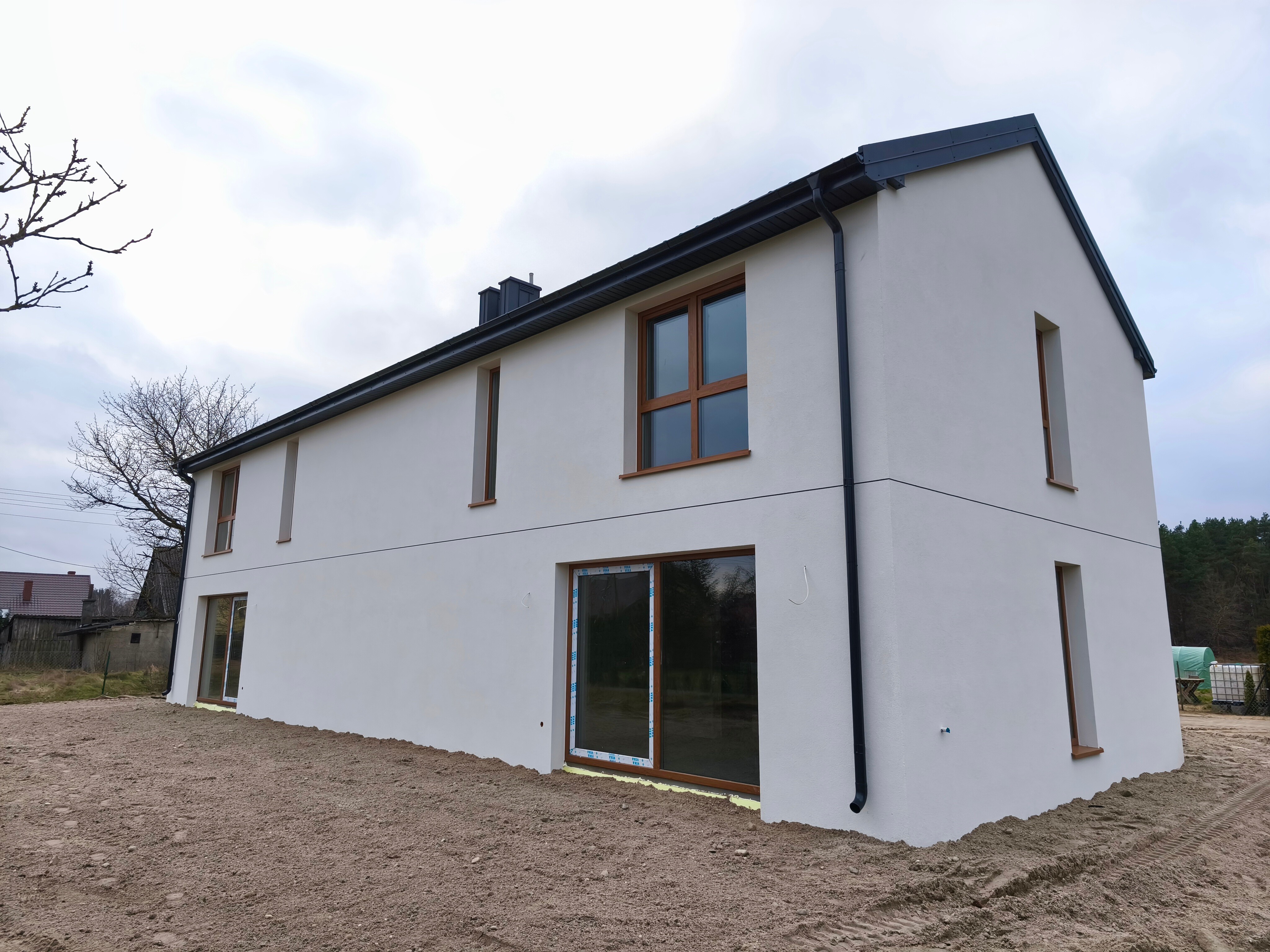 Dom wybudowany jest z silki 18cm, ściany działowe gazobeton 12cm, ocieplony 18cm styropianem, strop pianą. Dach pokryty jest blachą, okna trzyszybowe. W budynku rozprowadzone są wszystkie instalacje. Kanalizacja i woda z gminnych sieci. Ogrzewanie w całym budynku jest podłogowe, piec gazowy.