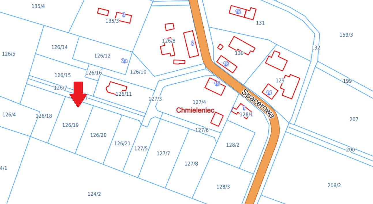Działka zlokalizowana jest w Chmieleńcu przy ul. Spacerowej. Jest to mała miejscowość w powiecie wejherowskim w gminie Łęczyce. W bezpośrednim sąsiedztwie znajdują się domy jednorodzinne i tereny niezabudowane. Wieś jest bardzo dobrze skomunikowana z Trójmiastem dzięki trasie kaszubskiej i połączeniu SKM.