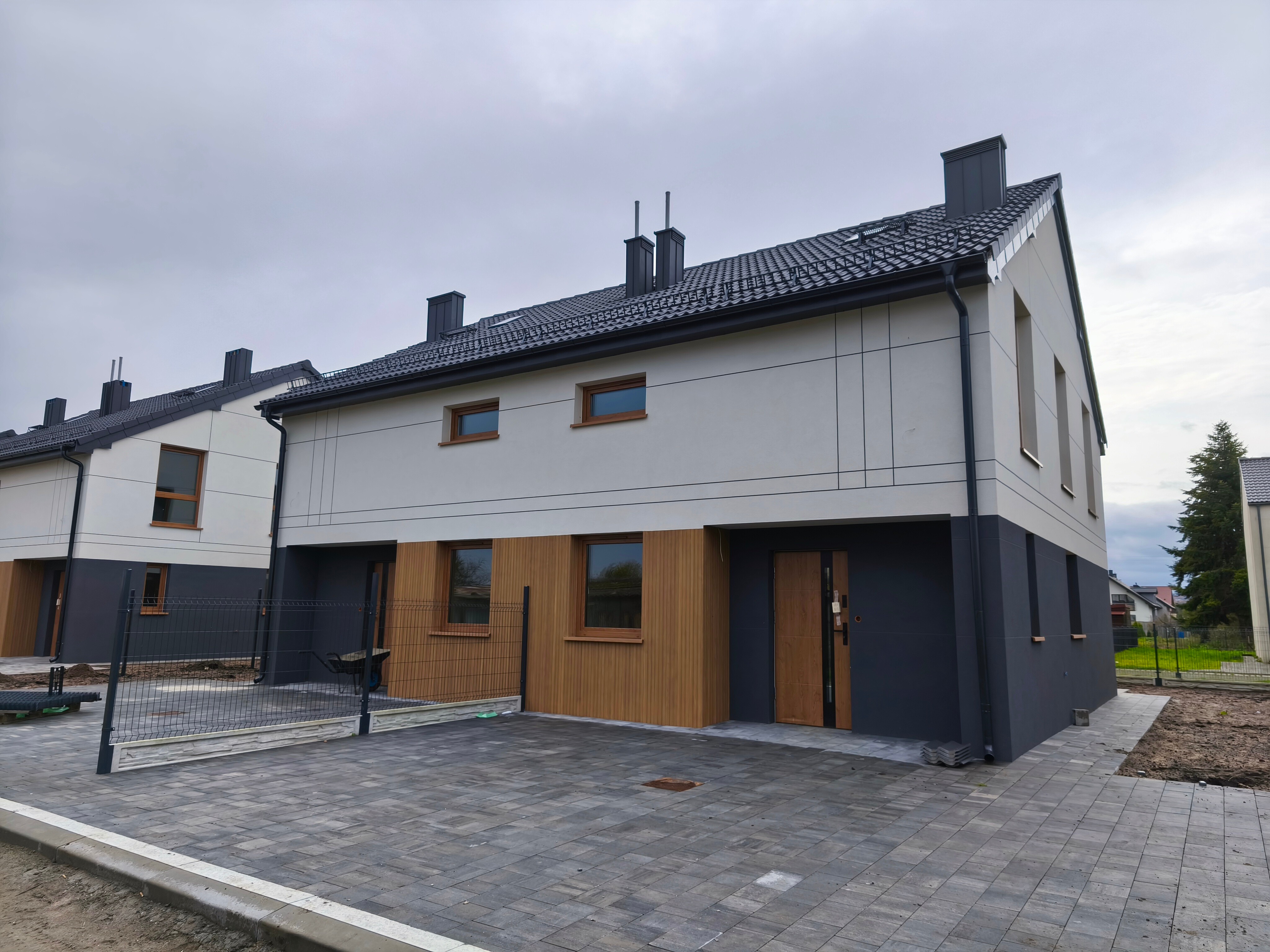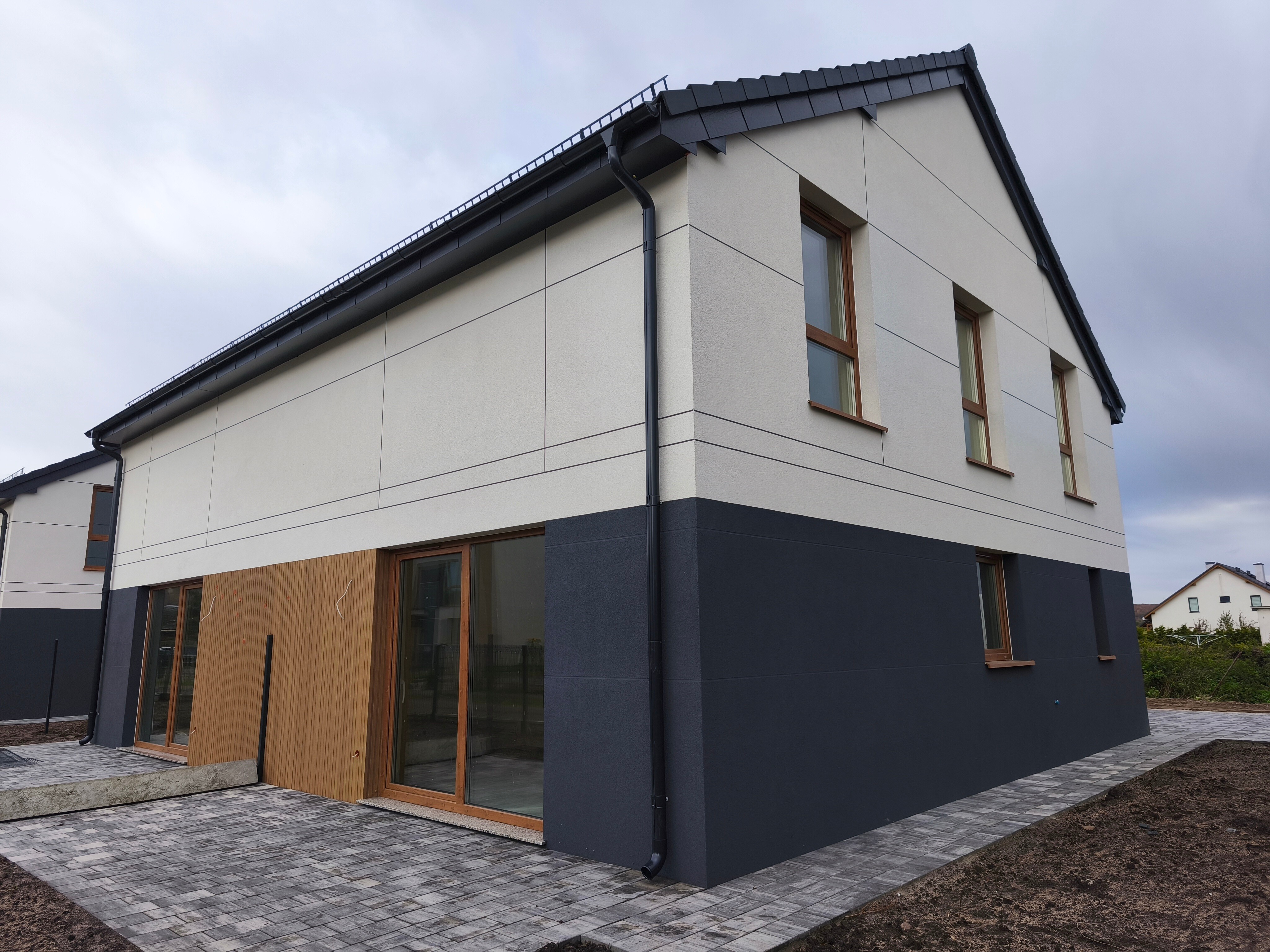 Dom wybudowany jest z niezwykłą starannością i dbałością o detale, a szaro-biała elewacja nadaje mu nowoczesny i elegancki wygląd.