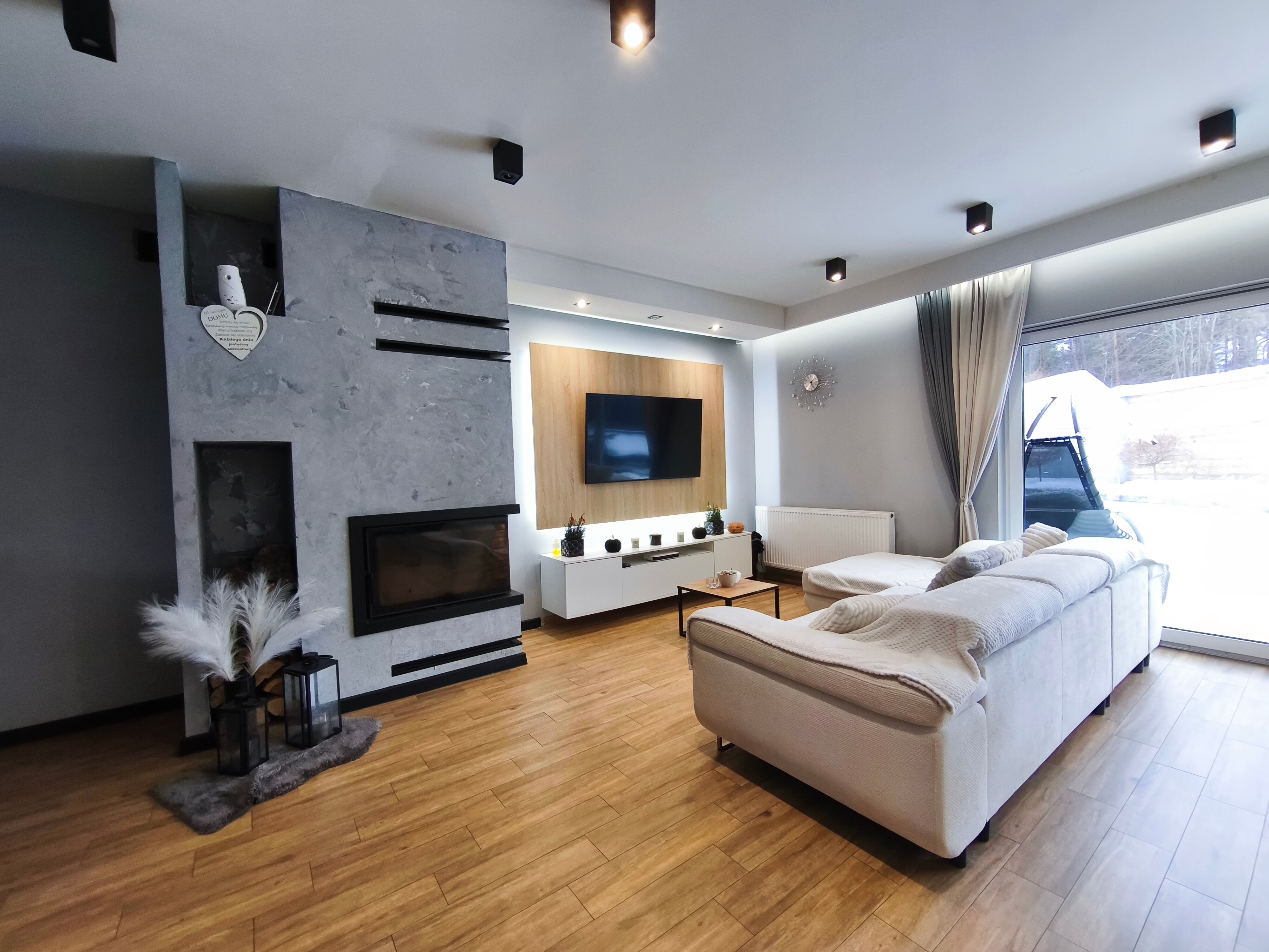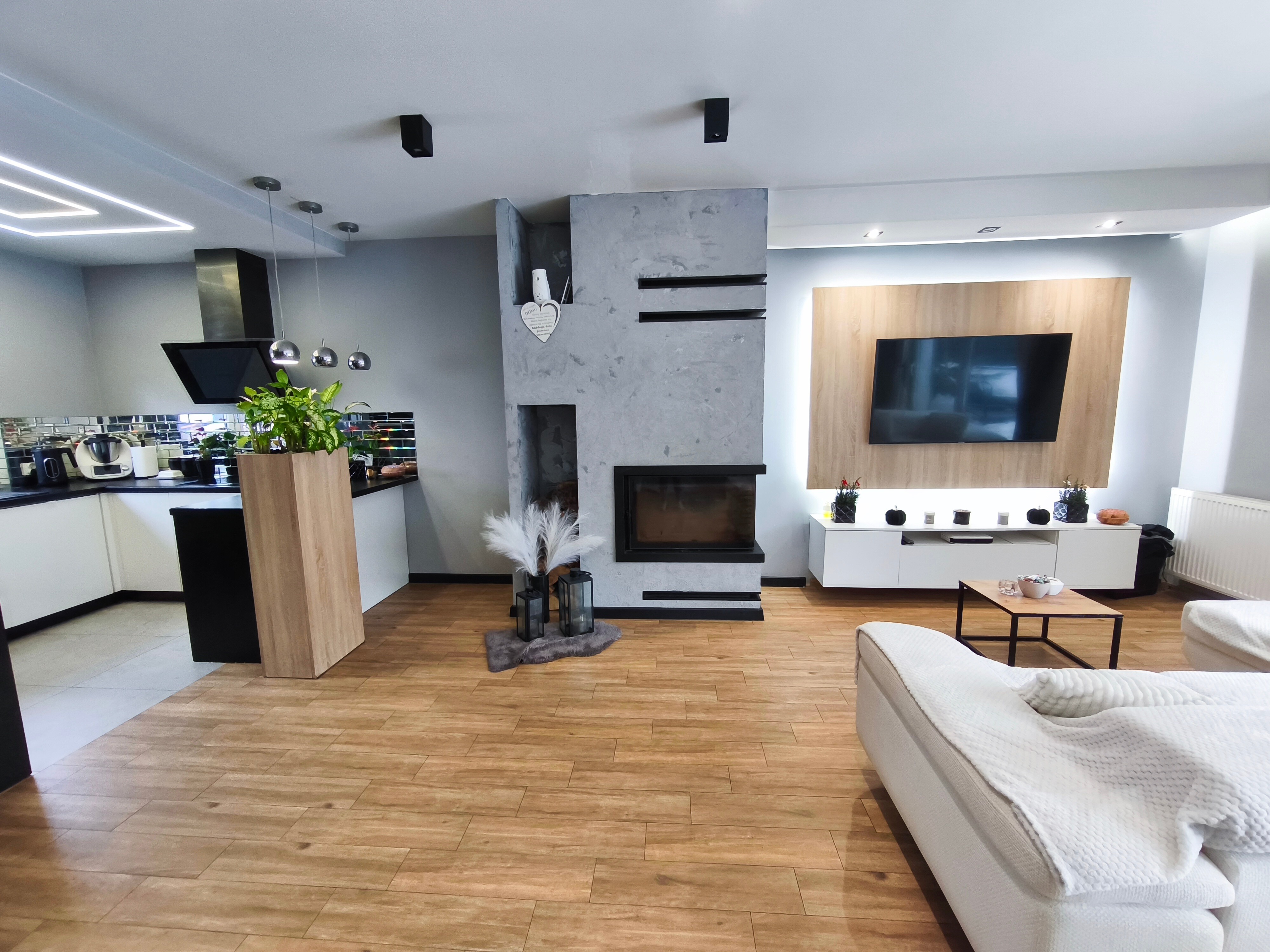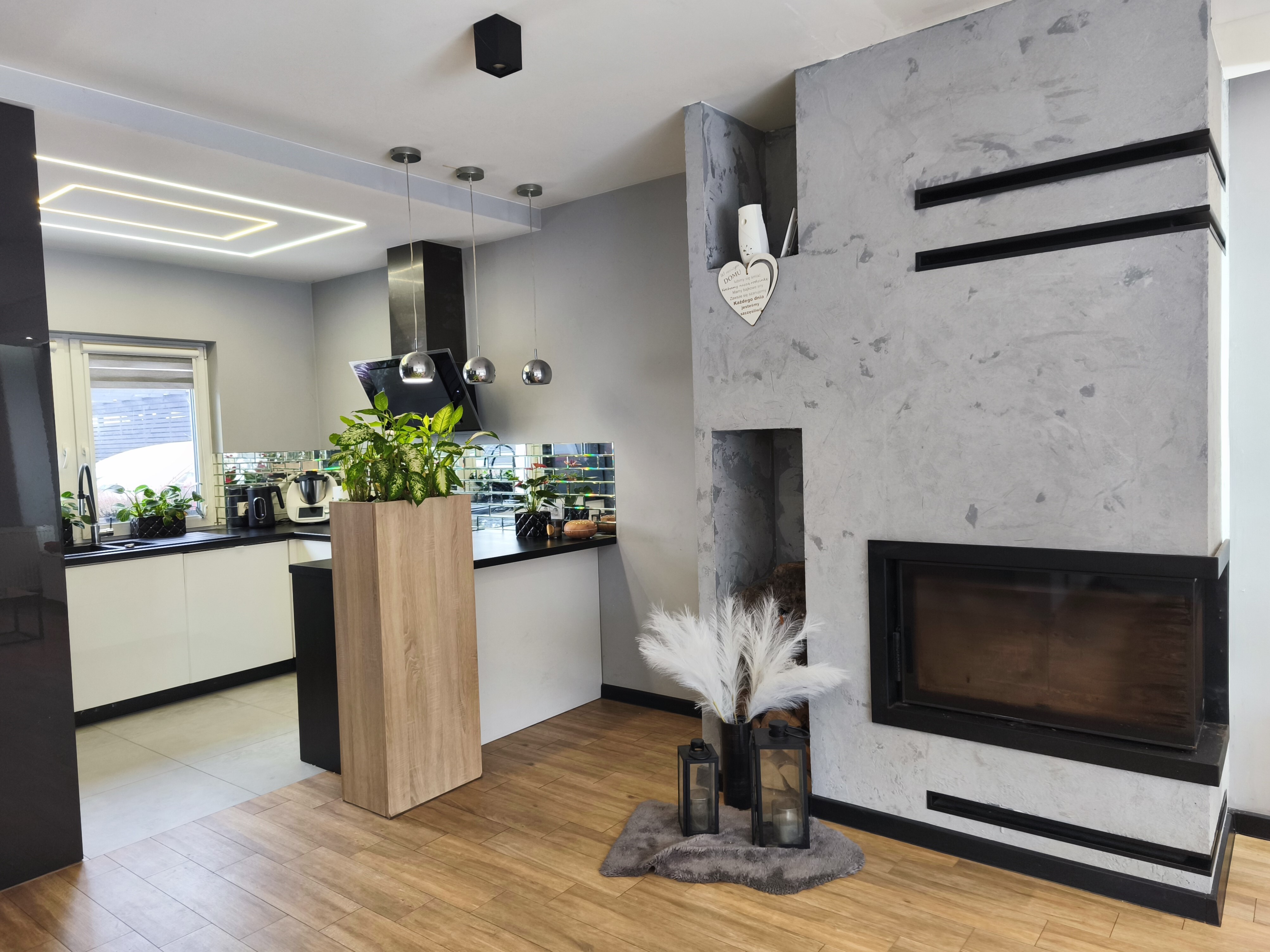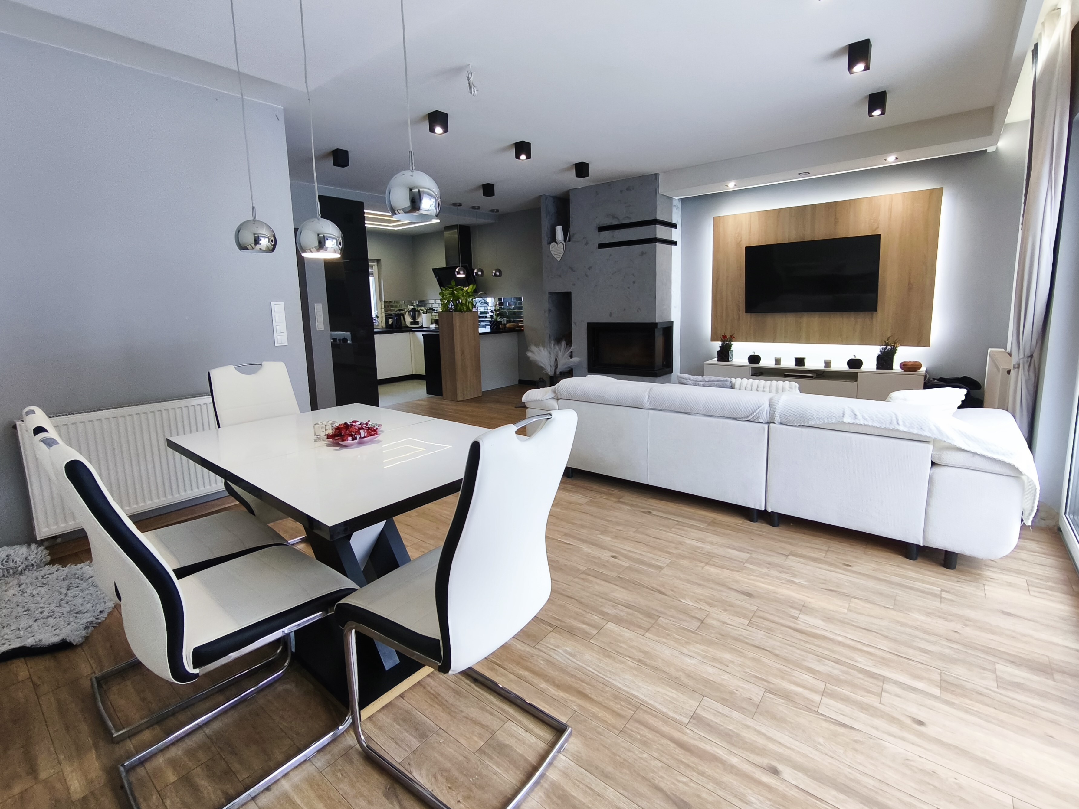Wnętrza domu są jasne i harmonijne, utrzymane w neutralnej kolorystyce, która daje poczucie spokoju i przestrzeni. Przestronny salon z kominkiem zaprasza do romantycznych wieczorów przy ogniu, a funkcjonalna kuchnia, w pełni wyposażona w niezbędny sprzęt, pozwala od razu poczuć się "u siebie" i realizować codzienne kulinarne przyjemności.