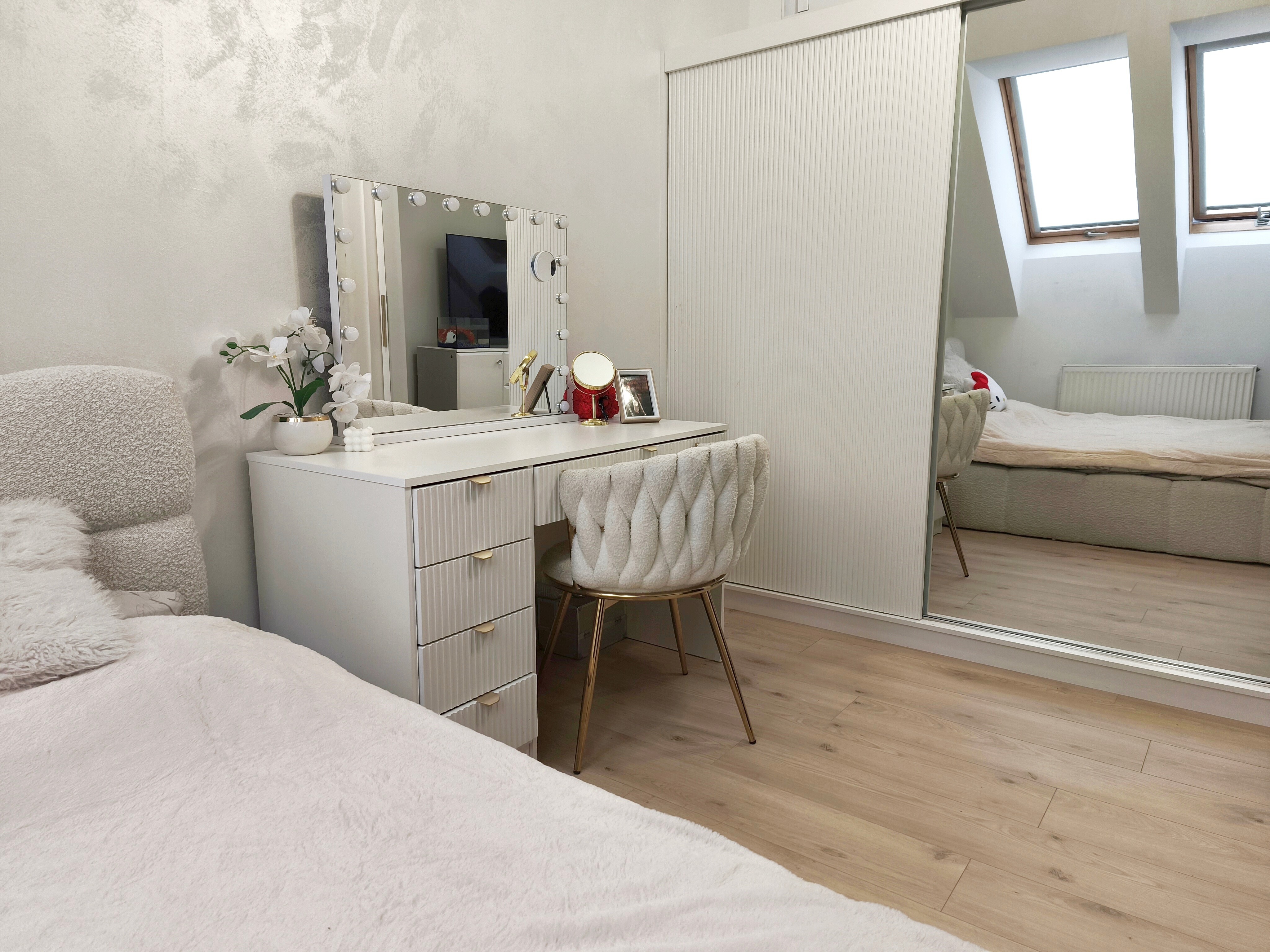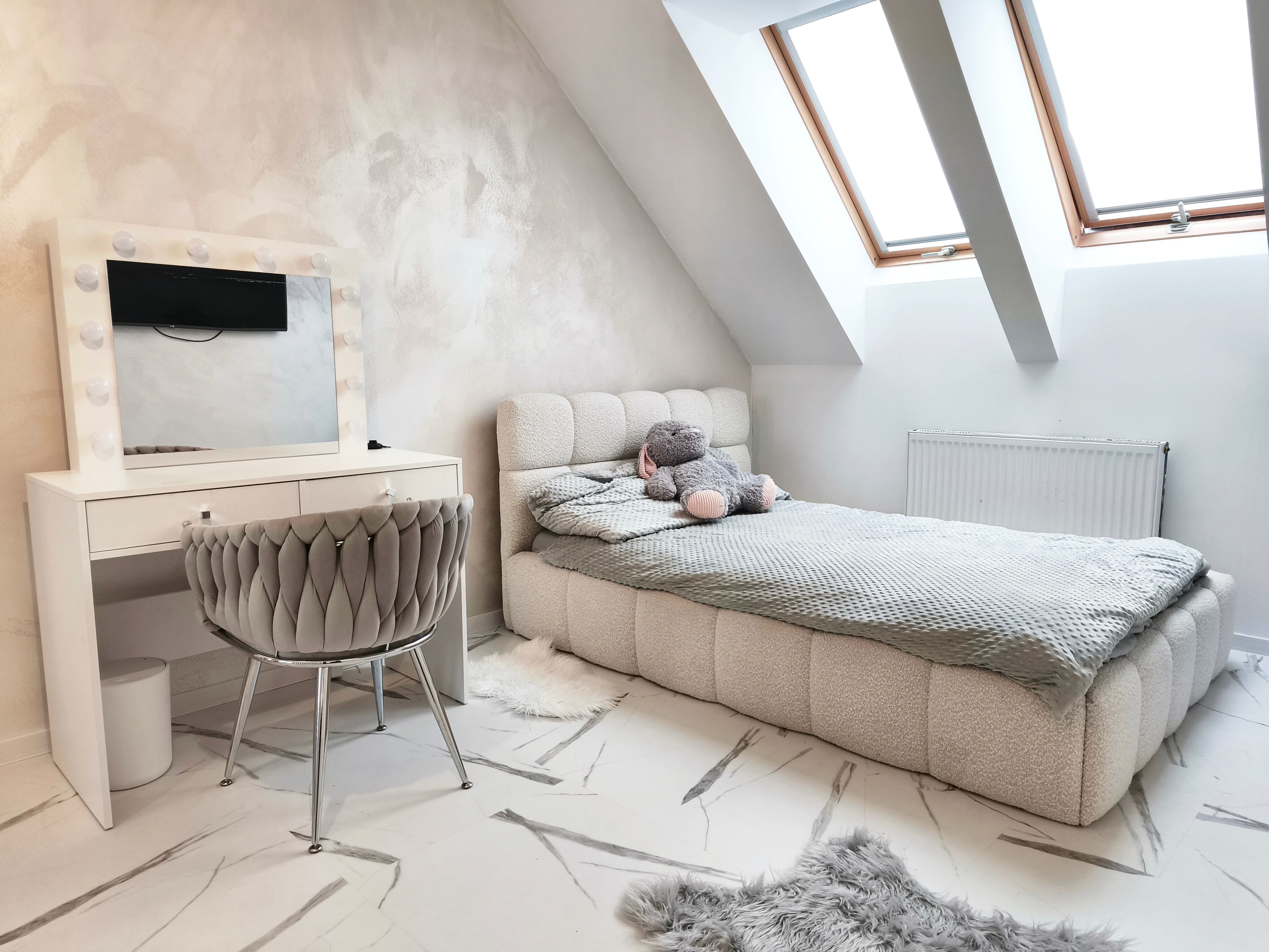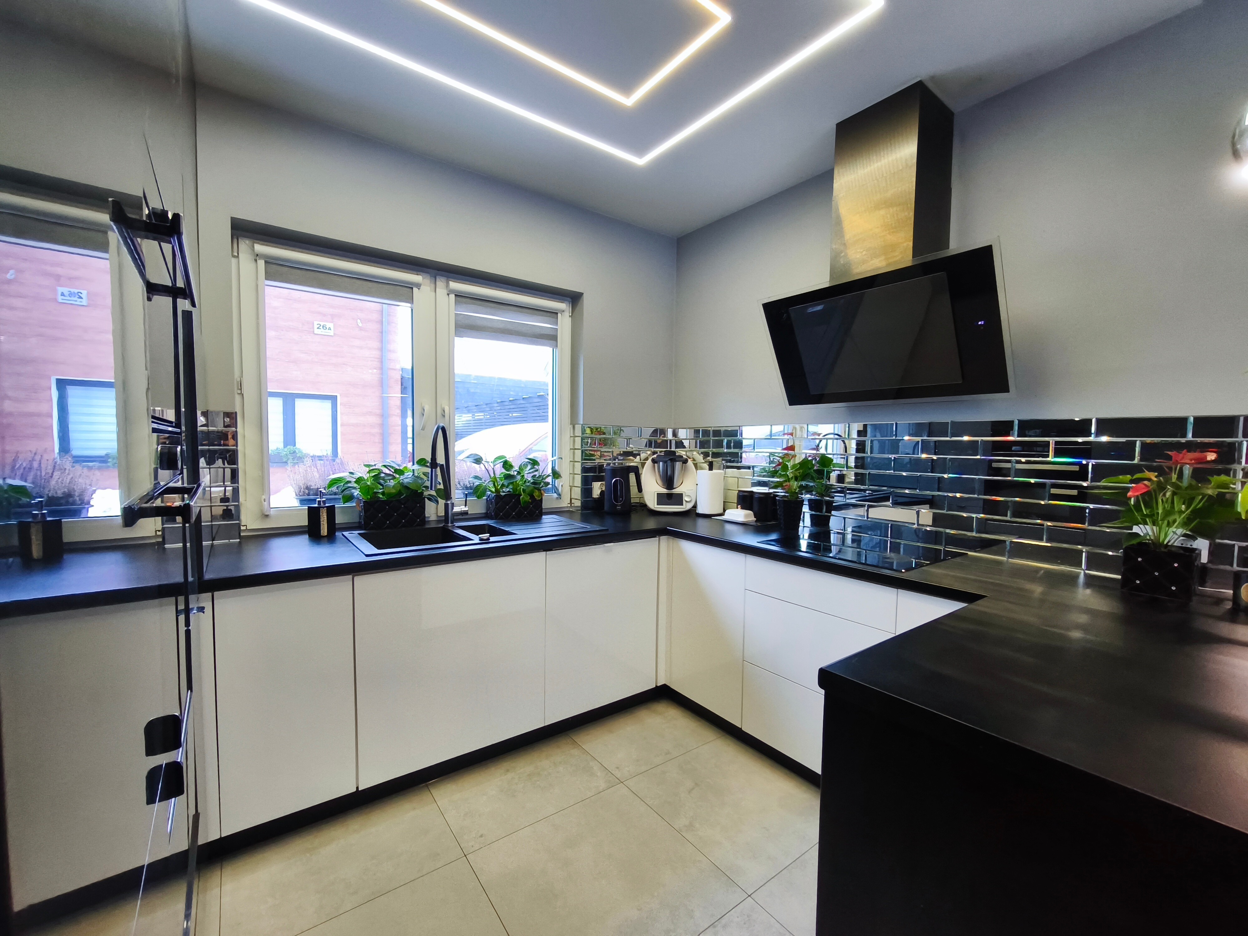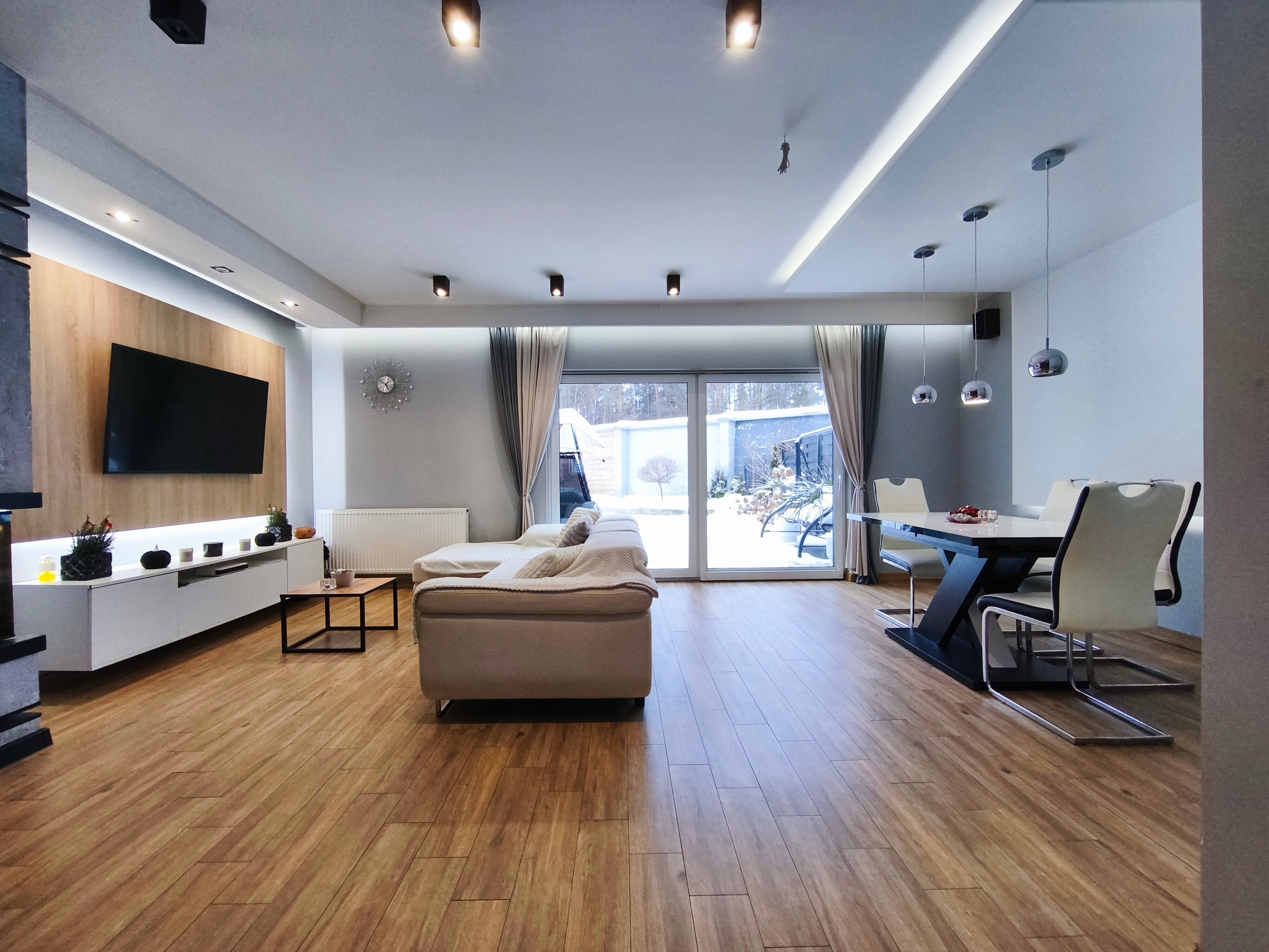 Wnętrza domu są jasne i harmonijne, utrzymane w neutralnej kolorystyce, która daje poczucie spokoju i przestrzeni. Przestronny salon z kominkiem zaprasza do romantycznych wieczorów przy ogniu, a funkcjonalna kuchnia, w pełni wyposażona w niezbędny sprzęt, pozwala od razu poczuć się "u siebie" i realizować codzienne kulinarne przyjemności.